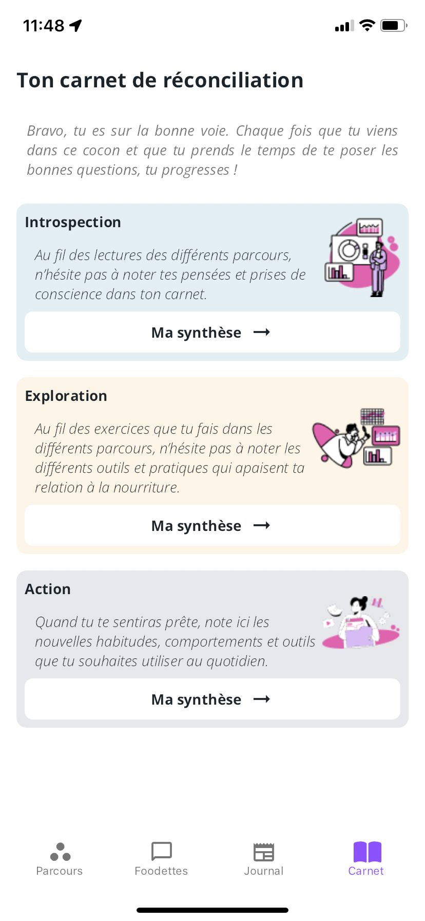 Un carnet au sein de l'application pour noter tes pensées et progrès au fil de tes parcours. Un espace pour sélectionner les outils et pratiques qui t'apaisent et construire ton plan d'action vers l'apaisement.