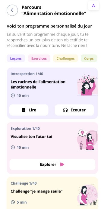 Adaptés à ton profil mêlant : des leçons pour comprendre ta relation à la nourriture, des exercices pour mettre en pratique et des outils à tester : hypnose, EFT, sophrologie...