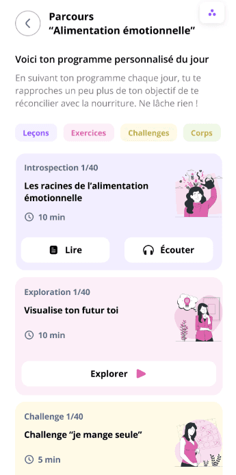 Plusieurs parcours pour explorer les différentes causes de ta relation conflictuelle à l'alimentation. Un programme adapté à ton profil correspondant aux réponses données au questionnaire.